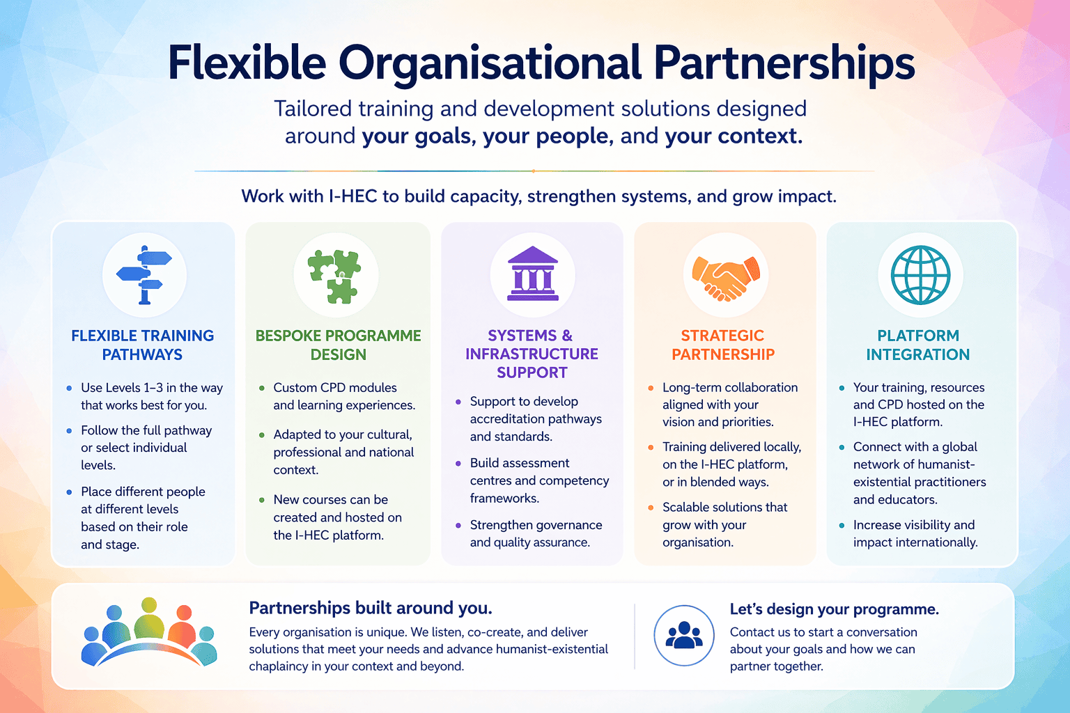 I-HEC exists to strengthen the field of humanist–existential chaplaincy by supporting formation, enhancing CPD, and contributing to consistent professional standards.